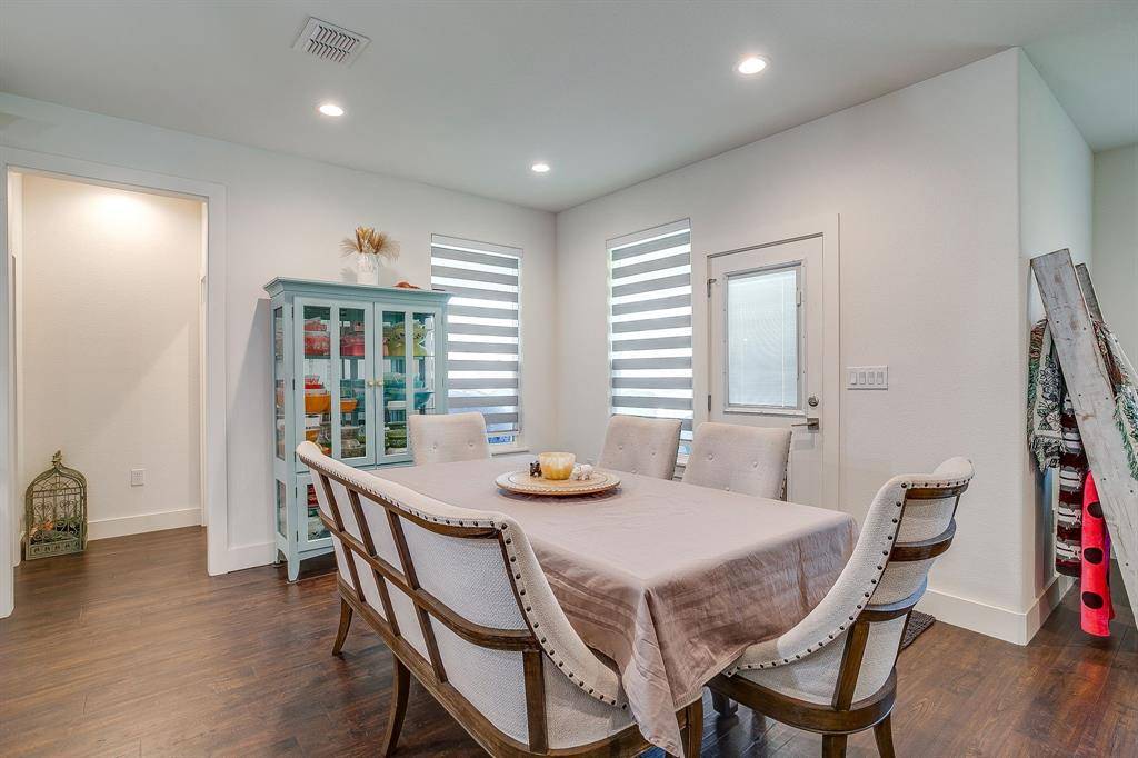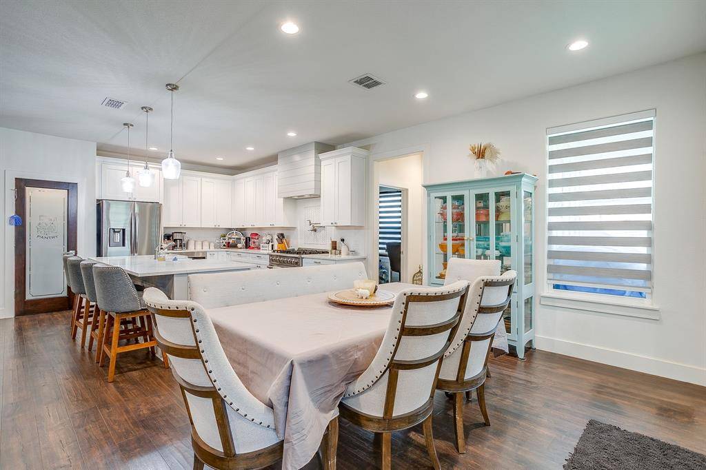 kitchen and dining area. The gourmet kitchen features cabinet with a pull out sprice rack, cabinet with a lazy susan, a six burner gas range, large prep island with seating for four,