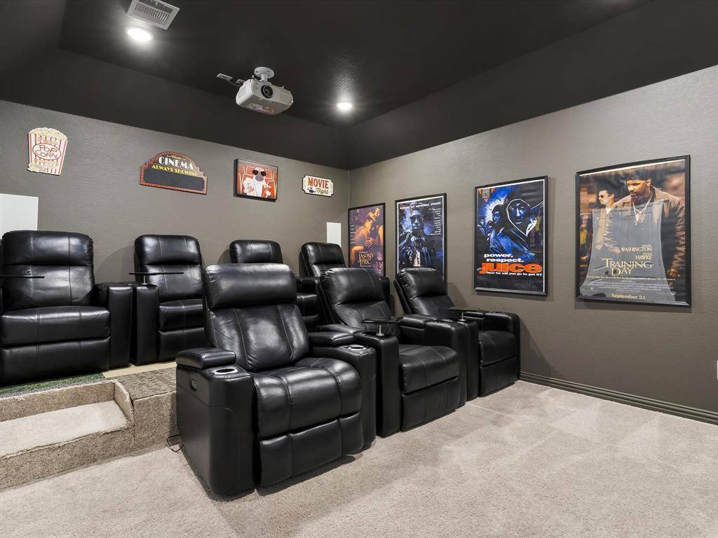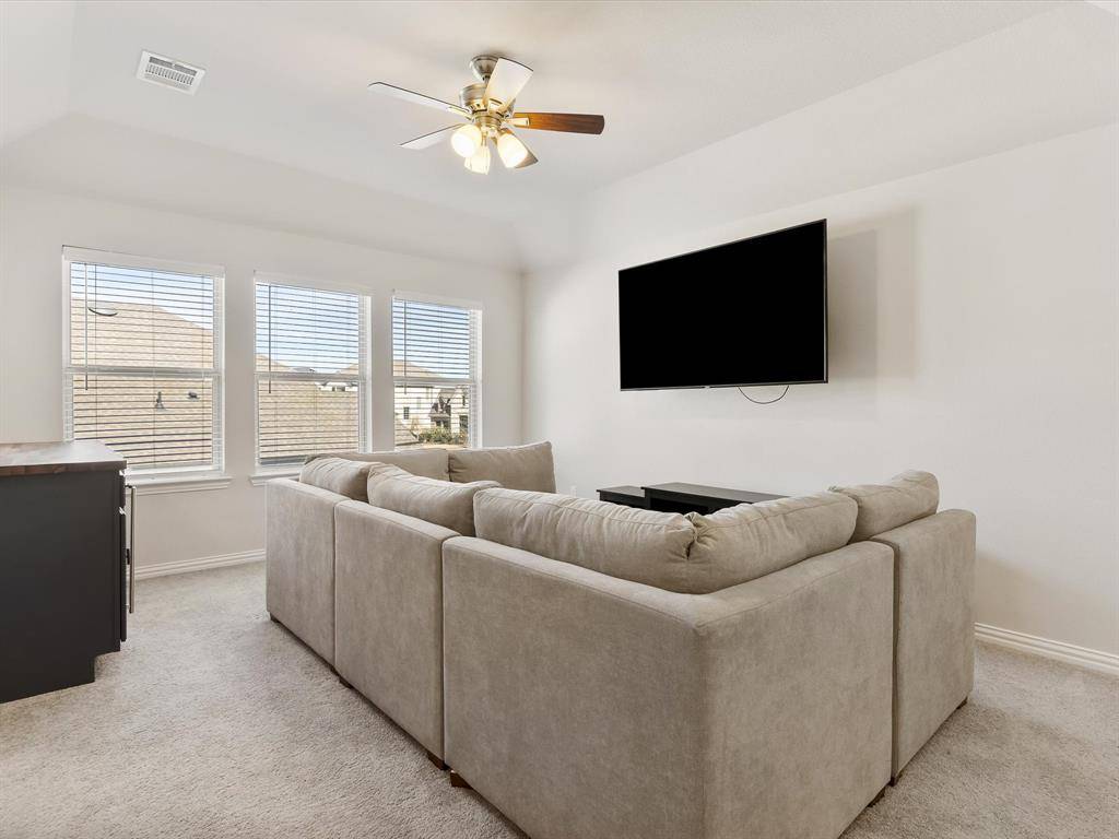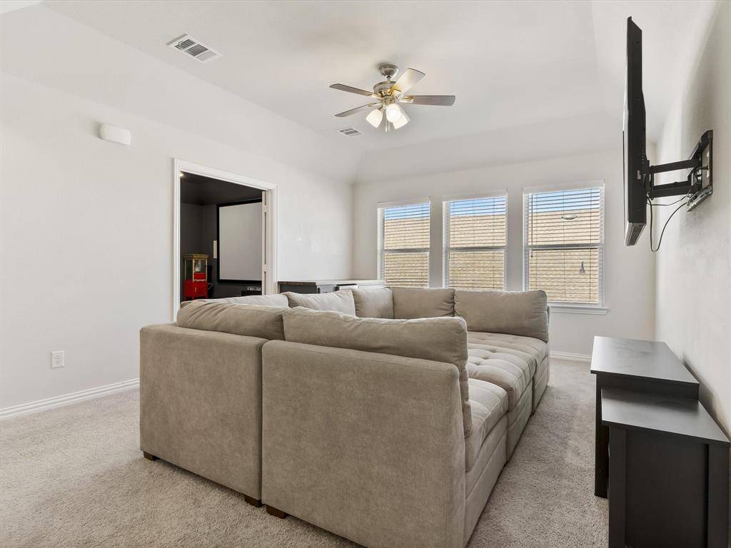 Soaring ceilings and natural light await you from the moment you step in the door. The office features beautiful French doors and a great sized closet, and could be used as a 5th bedroom! The living room is large enough for entertaining and the grand floor-to-ceiling fireplace is a beautiful centerpiece to the room! The kitchen is open and bright featuring a large breakfast bar, a wine fridge, a 5-burner gas stovetop, and large walk-in pantry with custom cabinets and countertops, perfect for tucking away those appliances! The primary bedroom is spacious with an ensuite bath featuring a separate shower and a large garden tub. The additional bedroom downstairs is great for guests! Upstairs you'll find a large family room, a well designed media room and 2 additional bedrooms. Outback there is a great covered patio and a large yard with no houses behind! Great for privacy! This home must be seen!