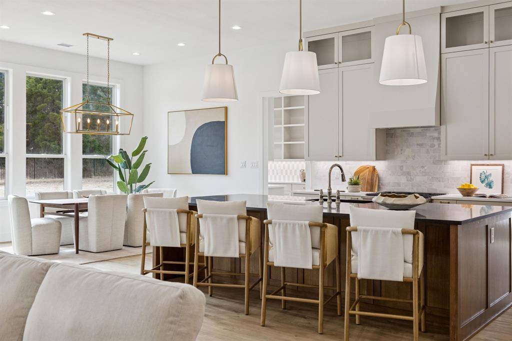 The living area centers around a striking fireplace with tailored wall detailing, creating a focal point that feels both elegant and welcoming. The open-concept layout flows effortlessly into the designer kitchen, where ceiling-height cabinetry, brushed brass hardware, and a dramatic oversized island create a perfect blend of style and function. Professional-grade appliances, double ovens, and abundant prep space make this kitchen ideal for both entertaining and everyday living.