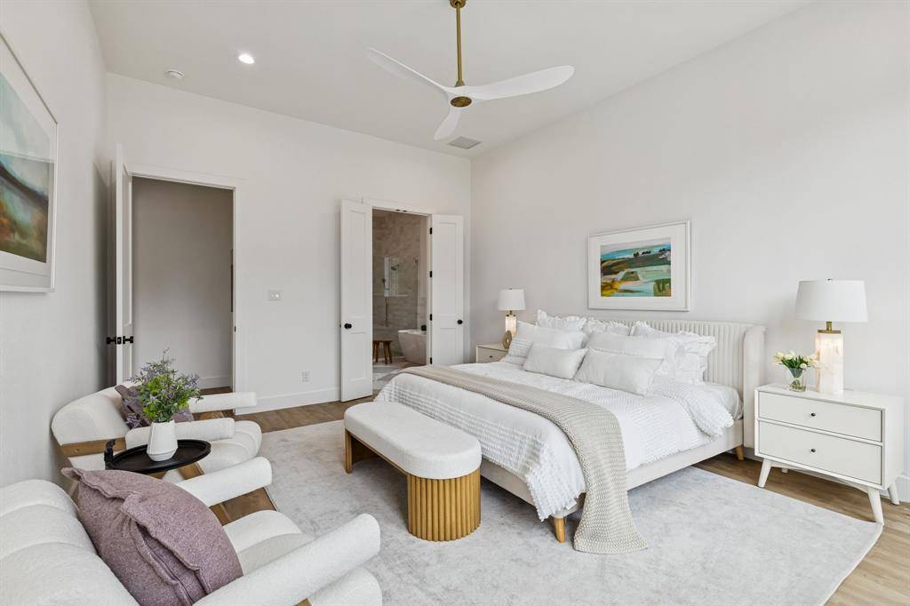 The private primary suite offers a serene retreat with spa-inspired bath, dual vanities, soaking tub, and a spacious walk-in shower. Additional bedrooms and flexible living spaces provide room for guests, work, or media, adapting beautifully to your lifestyle.