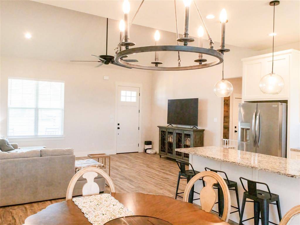Beuatiful move in ready 3 bedroom, 2 bath, Farmhouse style home in Rattler Ranch in the Tolar School district. This home has a lot of added amentities. Home is open concept with a split bedroom Primary ensuite bedroom setup. Ceramic tile in living, kitchen areas and carpeted in bedrooms. Home is finished out very nicely. Home has a sprinkler system, gutters around the house, wooden privacy fenced large backyard. Home is foamed insulated, with custom blinds throughout, soft closing cabinets, small desk area off the utility room, utility is off the garage and has a area for full size washer and dryer, drip hanging area. Primary bath is ensuite with walk in shower and oversized tub, individual vanities in primary bath with walk in closet. Home has Tolar city water and sewer built by True Texas Builders.