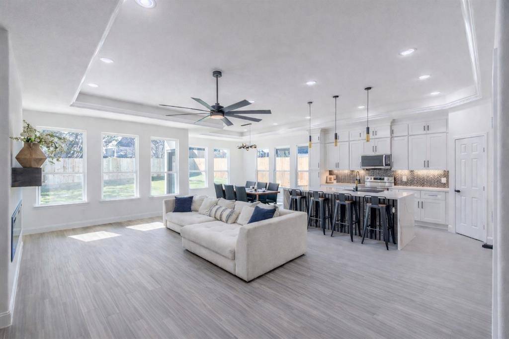 The living room centers around a fireplace, offering the perfect space to gather or unwind while still remaining connected to the kitchen and dining areas.