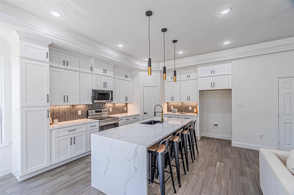 The kitchen is designed with both entertaining and everyday living in mind, showcasing an impressive 8-foot waterfall quartz island, custom cabinetry throughout, modern finishes, and plenty of workspace for cooking and hosting.