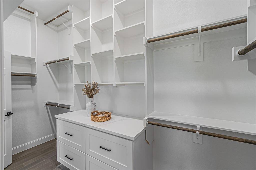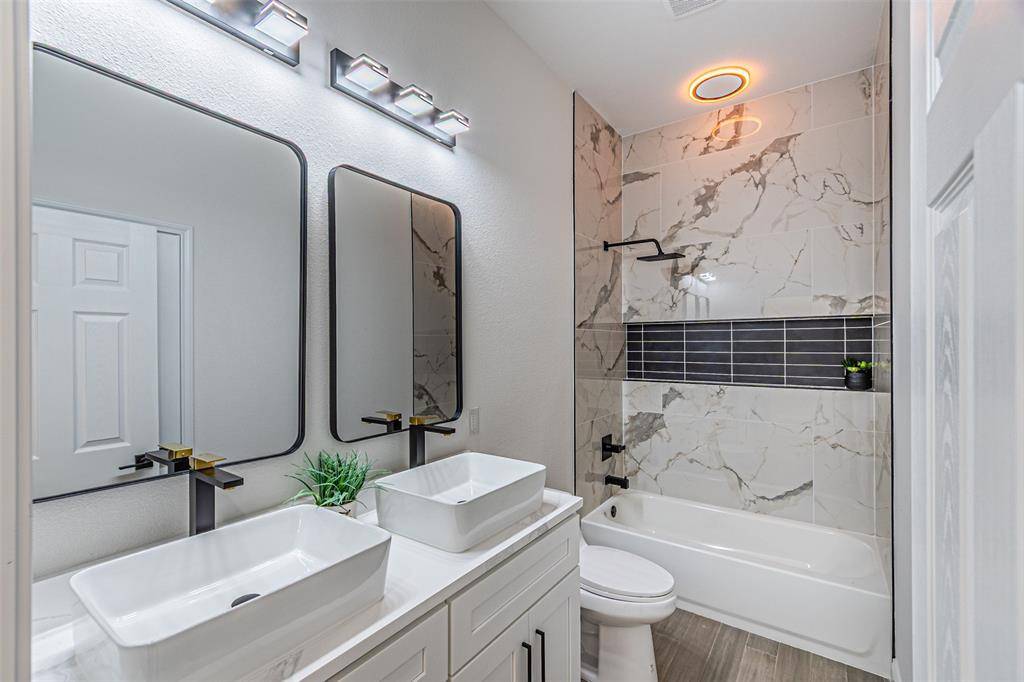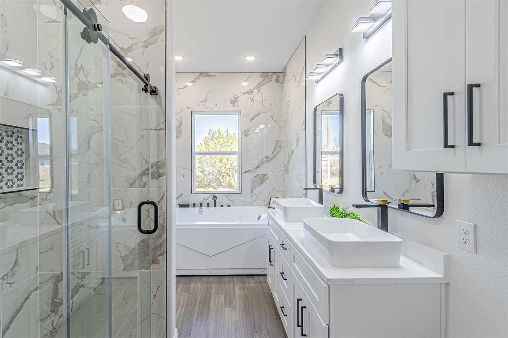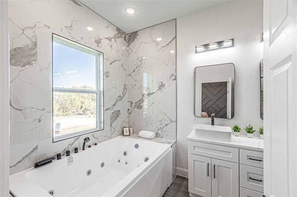 The primary suite offers a private retreat with its own statement accent wall and a spacious ensuite bathroom featuring a two-person jetted soaking tub, separate shower, and a custom upgraded walk-in closet designed for both style and storage.
