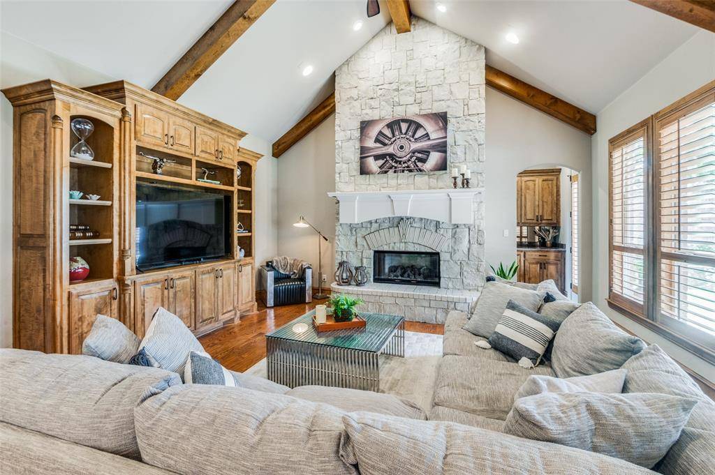 Step inside to a dramatic formal living room with soaring ceilings, custom built-ins, a fireplace, and serene pool views. The family room showcases vaulted ceilings with rich wood beams, a floor-to-ceiling stone fireplace and additional built-ins, creating a warm yet sophisticated gathering space.