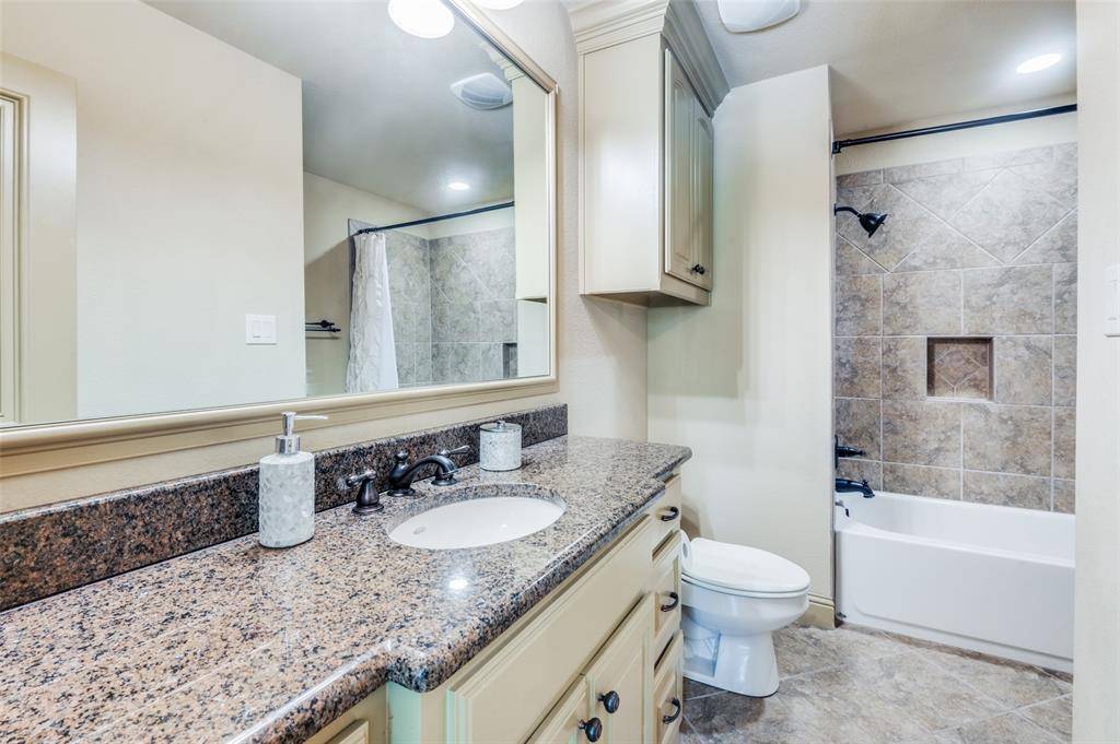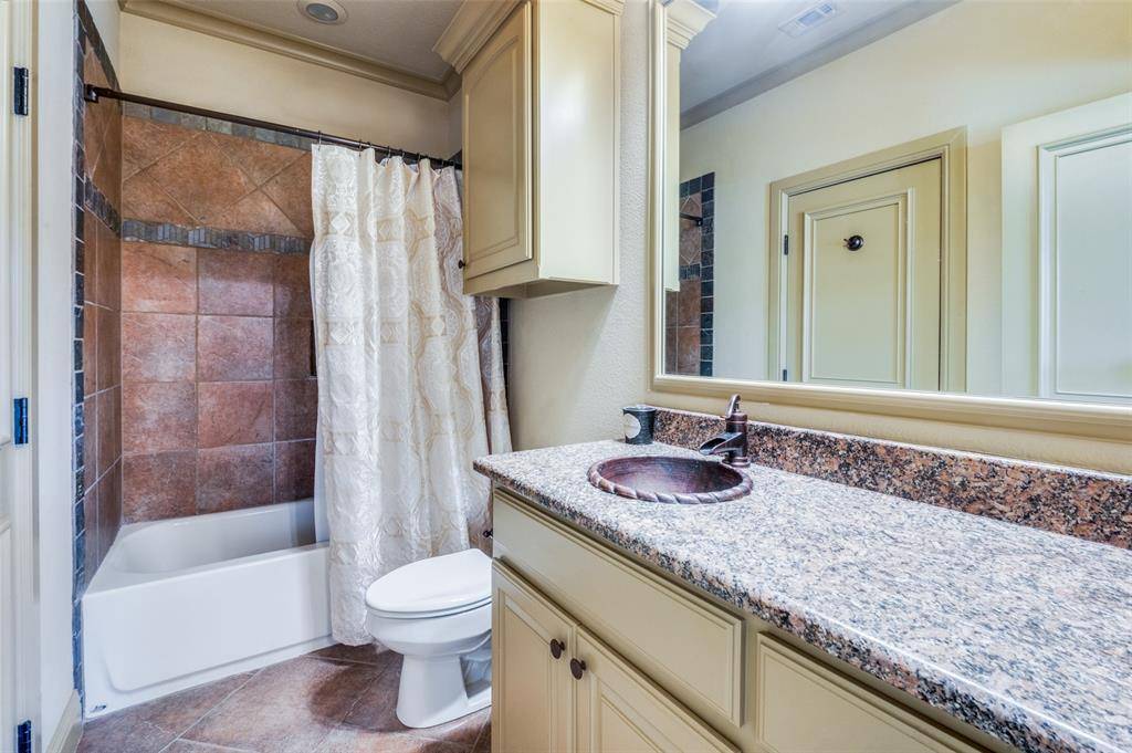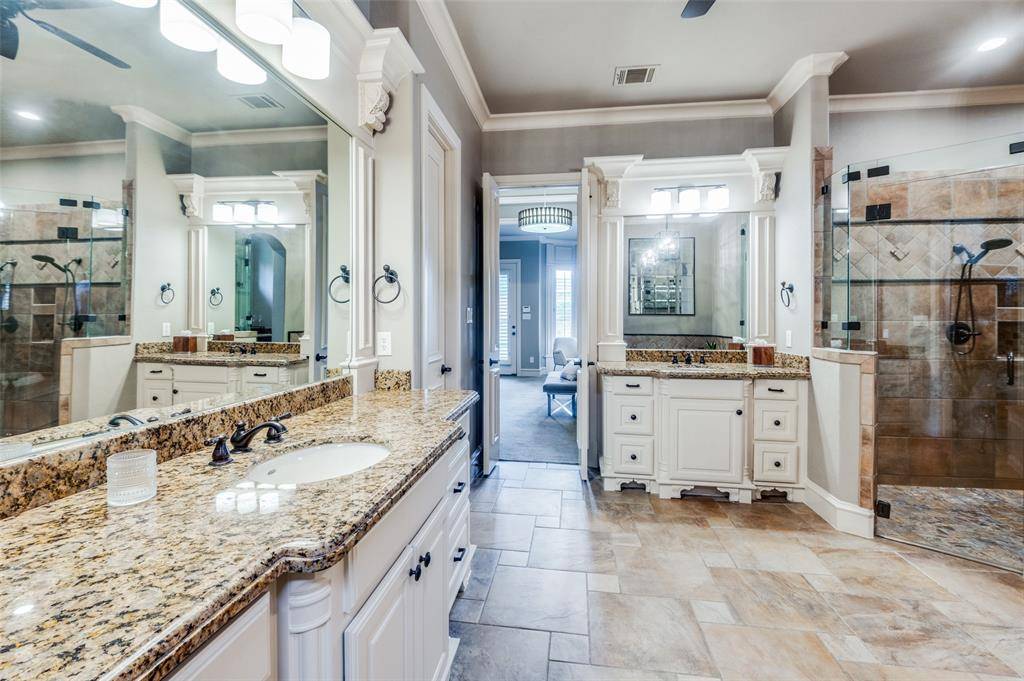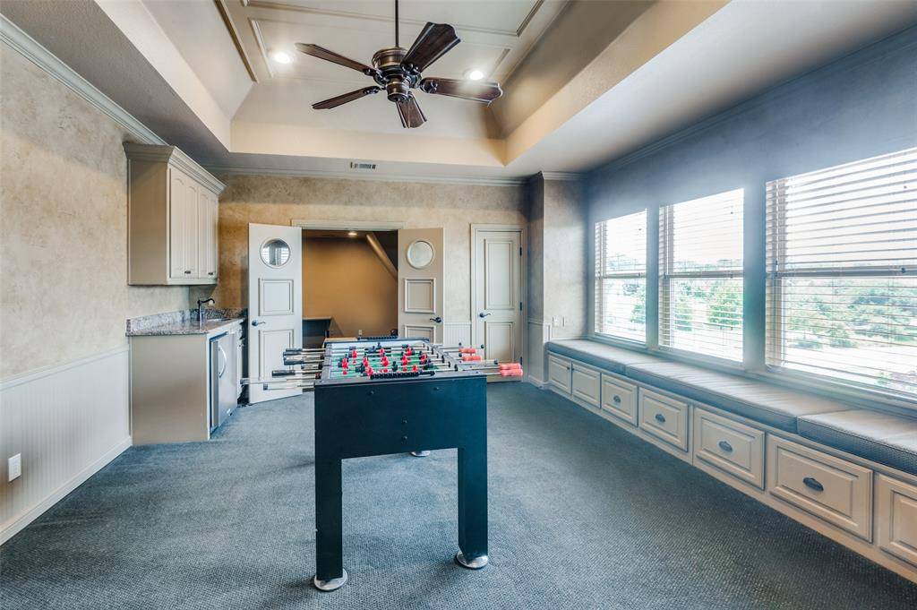 The gourmet kitchen is a chef's dream, featuring dual islands, dual sinks, two convection ovens, a 6-burner gas cooktop, built-in refrigerator and a walk-in pantry. Entertain with ease in the formal dining room and bright breakfast area. A distinguished executive study with rich wood detailing and built-ins provides the perfect work-from-home environment. The private owner's retreat is a true sanctuary, highlighted by a lighted tray ceiling, sitting area, and a luxurious ensuite bath offering dual vanities, soaking tub, oversized walk-in shower, coffee bar with sink, and two custom walk-in closets. A secondary bedroom with full bath downstairs provides added convenience. Upstairs, enjoy game night in the spacious game room with wet bar or movie night in the dedicated media room. Three generously sized bedrooms complete the upper level. The spacious laundry room includes abundant cabinetry, a sink, and space for a freezer. Step outside to your backyard paradise featuring a covered patio, outdoor fireplace, built-in grill, sparkling pool and spa, pergola with porch swing, and lush landscaping — perfect for year-round entertaining. Additional highlights include a 4-car garage with EV outlets and a new roof installed June 2024. This remarkable property combines luxury, functionality, and an unbeatable location.