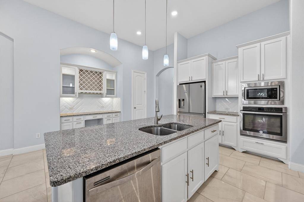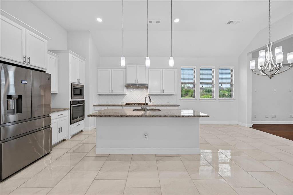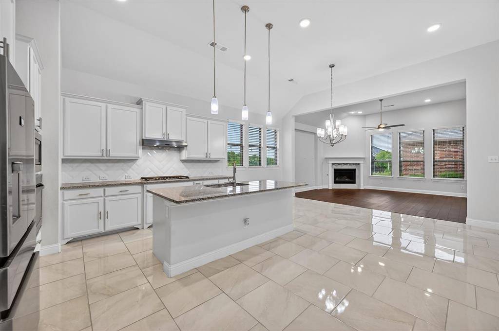 At the heart of the home is a chef-inspired kitchen featuring a large center island, granite countertops, stainless steel appliances, custom cabinetry, and designer lighting—perfect for entertaining or everyday living.